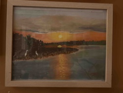 Framed Sunset Landscape Painting with Egrets