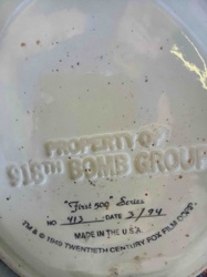 This item is a commemorative ceramic mug or vessel, likely a 'Toby' style or character mug, based on the '918th Bomb Group' from the 1949 film and subsequent television series '12 O'Clock High.' The base identifies it as part of the 'First 500' series, specifically hand-numbered 'No. 413' and dated '3/94.' The piece features heavy, raised relief lettering reading 'PROPERTY OF 918TH BOMB GROUP' integrated into the ceramic body. The exterior glaze is a creamy off-white or light beige, exhibiting some visible surface pitting and dark particulate matter embedded in or resting on the glaze, which may indicate production artifacts or deep-set grime. The rim bottom shows a raw ceramic foot ring indicative of traditional kiln-firing processes. Notable markings include a copyright for '1949 TWENTIETH CENTURY FOX FILM CORP.' and a 'MADE IN THE U.S.A.' stamp. While the copyright date refers to the original film's release, the handwritten date confirms a mid-1990s manufacture. The piece appears to be a high-quality licensed collectible intended for military aviation enthusiasts and fans of classic cinema, characterized by its thick-walled construction and specialized numbering.
