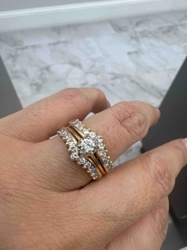 This is a vintage gold band featuring three small round-cut stones, which appearing to be blue sapphires. The metal exhibits a rich yellow hue characteristic of 10k or 14k yellow gold and shows a significant amount of surface patina and fine scratches, suggesting regular wear over a long period. The stones are set in a flush or gypsy-style mount within a slightly graduated band that tapers toward the back. The three stones are spaced closely together along the top face of the ring. Based on the petite scale and relatively simple design, this piece likely dates to the mid-20th century. The band appears to be structurally sound with a thick enough shank for continued use, though the gemstones should be checked for loose prongs or settings. A professional polishing could restore the original luster, but the current aged patina is typical for a piece of this era. No visible hallmarks are discernible from this angle, but they are likely located on the inner circumference of the band. The craftsmanship appears to be commercial grade from the vintage era, characterized by solid metalwork and classic stone placement.
