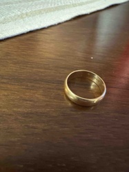 This item is a classic D-shape or 'half-round' yellow gold wedding band, characterized by a rounded exterior and a flat interior surface. The ring appears to be of medium width, approximately 4mm to 6mm, with a substantial thickness indicating high-quality construction. It is crafted from a polished yellow precious metal, likely 10k, 14k, or 18k gold. The interior of the band features visible stamped hallmarks, which are essential for identifying the gold karat weight and the manufacturer's mark, though they are not fully legible from this distance. The surface of the gold shows a well-worn patina with numerous small surface scratches and minor abrasions consistent with daily wear over several years. There are no signs of structural deformation or major gouges. The style is timeless and minimalist, common across many decades of the 20th and 21st centuries. The craftsmanship is professional and seamless, showing no signs of resizing or solder lines on the visible exterior. The color is a rich, warm gold tone, typical of higher-karat alloys.