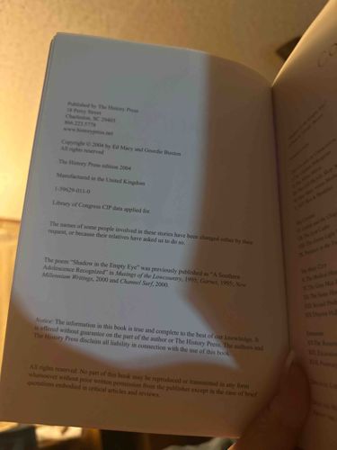 This is a softcover book titled 'Haunted Charleston,' published by The History Press in 2004. The image displays the copyright page and a portion of the table of contents. According to the visible text, the copyrights belong to Ed Macy and Geordie Buxton. Specifically, this is The History Press edition from 2004, manufactured in the United Kingdom with the ISBN 1-59629-011-0. The pages appear to be made of standard trade paperback stock with black ink printing. Physically, the book exhibits evidence of handling; there is a noticeable crease near the top left corner of the copyright page and some gentle waving of the paper, likely due to storage environment or previous use. The lighting in the photograph suggests a yellowish tint, though the paper itself appears to be a natural white or off-white. The craftsmanship is typical of 21st-century regional interest trade paperbacks, featuring clean typography and standard margins. There are no visible markings such as library stamps, signatures, or inscriptions in this specific view, though the presence of an individual's thumb holding the page open indicates the binding is flexible and intact. The content focuses on local folklore and ghost stories related to prominent South Carolina institutions.
