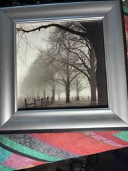 Framed Atmospheric B&W Landscape Photograph of a Foggy Orchard