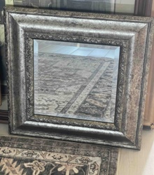 Beveled Square Wall Mirror with Ornate Antiqued Silver Leaf Frame
