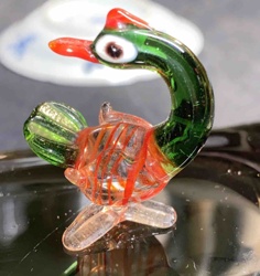 This item is a small-scale, handmade glass figurine depicting a stylized duck or aquatic bird, created using the lampworking or torchworking technique. The figurine features a multi-colored composition, with a transparent emerald green neck and head, a translucent clear body decorated with internal orange-red spiral stripes, and a green fan-shaped tail. The beak is rendered in a bright orange-red glass, while the eyes consist of applied white glass with dark central pupils. The bird stands on two clear, flattened glass feet. The craftsmanship indicates a mid-20th-century origins, common for Murano-style or Czech-style miniatures produced primarily between the 1960s and 1980s. The piece shows characteristic handmade traits, such as slight asymmetry and visible tool marks where the glass was pulled and shaped. The condition appears to be excellent with no visible chips, cracks, or repairs. The high-gloss finish is well-preserved, and the internal ribboning demonstrates a skilled control of heat and material manipulation. There are no visible maker's marks or signatures, which is typical for such small-scale glass novelties meant for collectors' curios or shadow boxes.