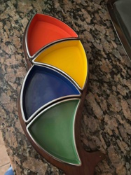 Mid-Century Modern Digsmed Enamel and Teak Fish-Shaped Revolving Relish Tray