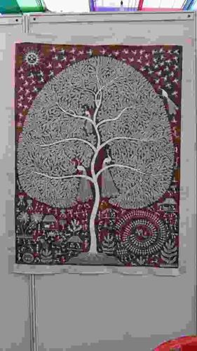 This is a contemporary Warli tribal painting, likely executed on a canvas or cloth substrate with a deep maroon or burgundy background. The central focal point is a stylized 'Tree of Life' rendered with white pigment, featuring a highly symmetrical canopy consisting of intricate, dense leaf patterns. Notable details include stylized peacocks perched within the branches and a sun motif in the upper left corner. The surrounding space is filled with characteristic Warli stick figures engaged in daily village activities, ritual dances (a spiral Tarpa dance is visible in the lower right), and depictions of nature. The craftsmanship demonstrates the traditional geometric vocabulary of the Warli tribe, where circles represent the sun and moon, triangles represent mountains and trees, and squares signify sacred enclosures. The piece appears to be in good condition with minor fraying along the lower edge of the textile. This style of folk art originates from the North Sahyadri Range in Maharashtra, India. The use of white pigment (traditionally a mixture of rice paste and water with gum) against the dark earthen background creates a striking contrast typical of 20th to 21st-century adaptations of this ancient tribal art form.
