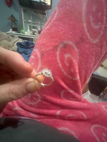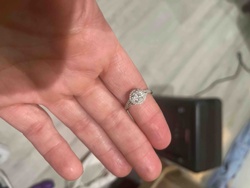 This item is a halo-style ring crafted in sterling silver, as indicated by the '925' context provided. The piece features a prominent central stone, likely a cubic zirconia or a lab-created white sapphire, characterized by a round brilliant cut. This center stone is encircled by a 'halo' of smaller pavé-set round stones, which enhances the visual scale and brilliance of the primary gem. The shank or band of the ring is further embellished with inset gemstones extending down the shoulders, creating a continuous sparkling effect. The metal exhibits a bright, high-polish white luster typical of rhodium-plated sterling silver, which is used to prevent tarnish and mimic the appearance of white gold or platinum. The construction appears to be a modern cast piece, reflecting a contemporary bridal or high-fashion aesthetic. While the image shows the ring in relatively good condition with no visible missing stones, the low-resolution nature of the photo makes it difficult to assess fine scratches or wear on the prongs. The setting style aims for a luxury look but is executed in accessible materials, making it a versatile piece of bridge jewelry. The craftsmanship shows standard commercial quality with symmetrical prongs and a classic tiered head design.