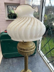 Victorian-Era Brass Banquet Oil Lamp with Swirl Opaline Glass Shade