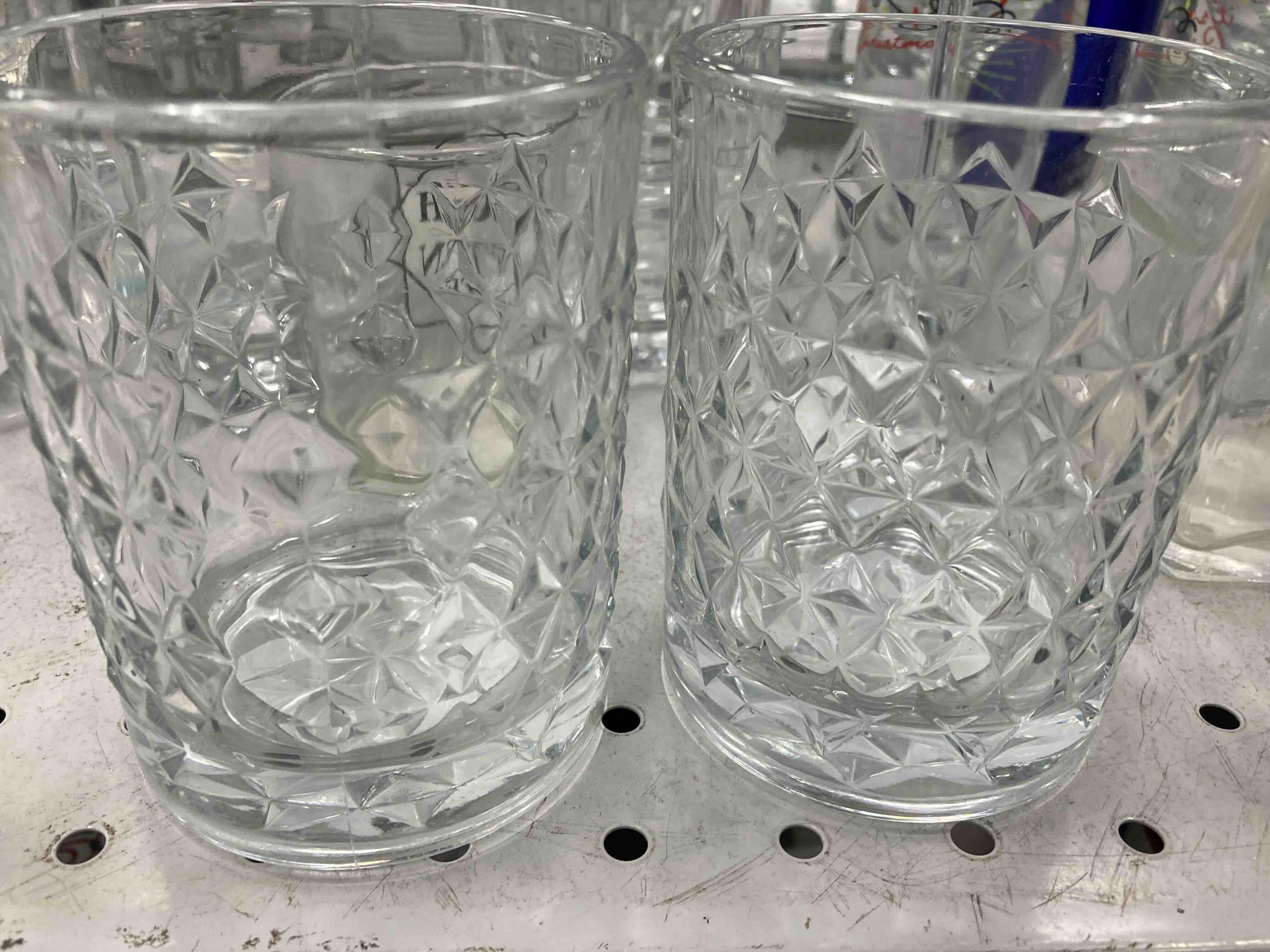 This pair of pressed glass whiskey or rocks tumblers features a striking 'Diamond Point' or pineapple texture that covers the exterior walls of each vessel. Made from clear soda-lime glass, these tumblers possess a cylindrical form with a robust, weighted base for stability. The geometric pattern is composed of numerous small, raised triangular facets that reflect light efficiently, a design choice popularized in mid-to-late 20th-century glassware. The top rims are smooth and slightly rounded, while the base remains flat. One glass retains a partial manufacturing label, though the specific branding is obscured. The glass exhibits good clarity with a faint bluish-green tint visible in the thicker base edges, which is typical of mass-produced commercial glass. Regarding condition, the items show minimal signs of use; however, fine surface scratches are visible on the interior and bottom due to shelf wear and handling. No structural cracks or significant chips were detected along the textured surface or the mouth edge. These items likely date from the 1970s to the 1990s and represent functional, everyday barware crafted with a classic aesthetic.