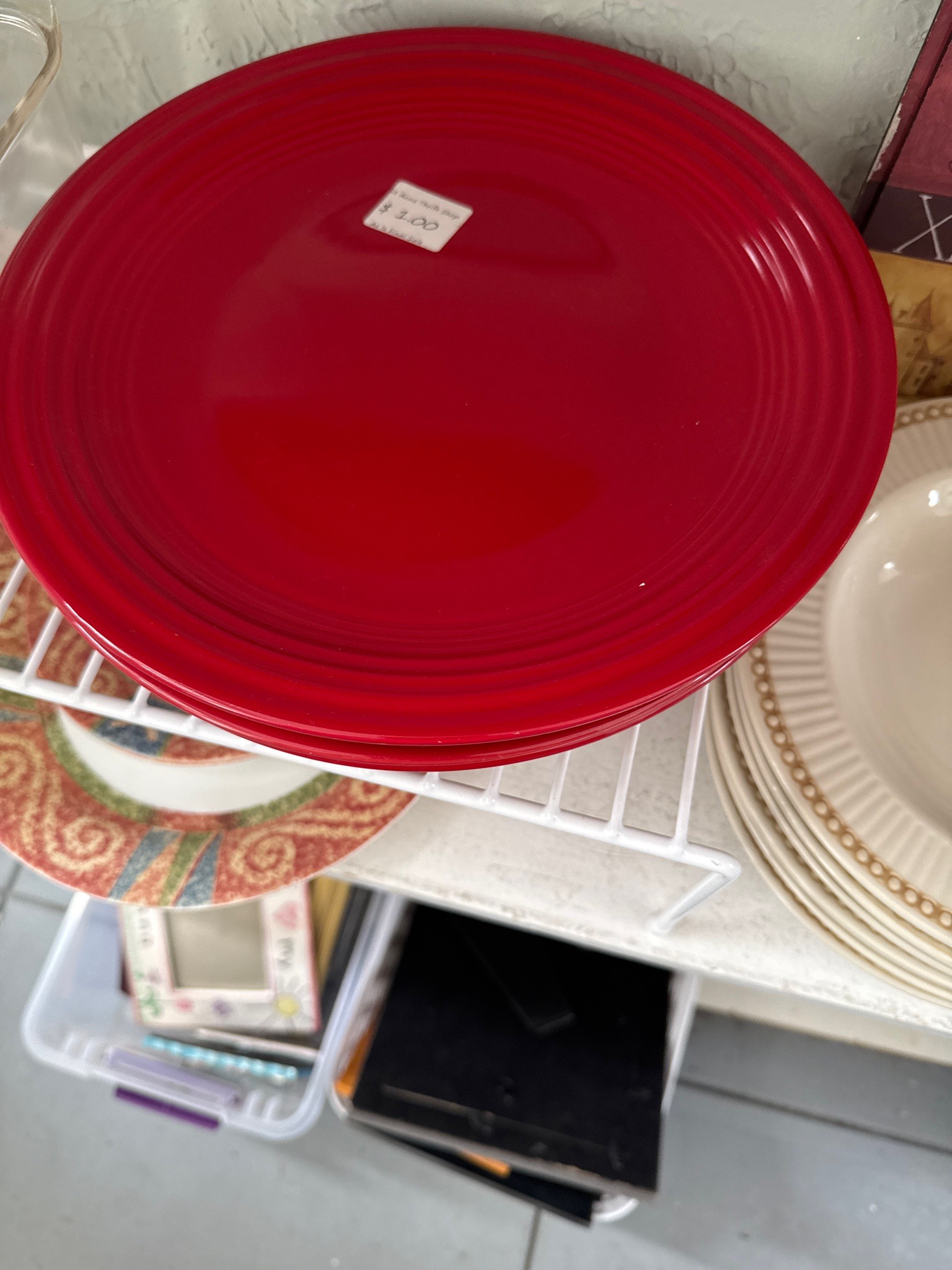 This is a stack of circular dinner plates, identifiable as contemporary Fiesta ware (produced by the Homer Laughlin China Company) in the 'Scarlet' glaze. The plates are crafted from lead-free vitrified ceramic, featuring the iconic concentric ring patterns along the wide rim. The Scarlet glaze is a deep, vibrant, and solid red with a high-gloss finish. Based on the uniform application of the glaze and the specific depth of the red, this appears to be the post-1986 modern production rather than the vintage 'Radioactive Red'. The plate surface is smooth with a slightly concave center. Visible on the top plate is a white adhesive thrift store price tag marked '$2.00'. The condition appears excellent with no visible chips, cracks, or heavy cutlery scratches on the upper surface available in the view. The craftsmanship is consistent with industrial manufacturing standards, showing even firing and glaze thickness. Similar plates are typically 10.5 inches in diameter and are valued for their durability and classic Art Deco styling.