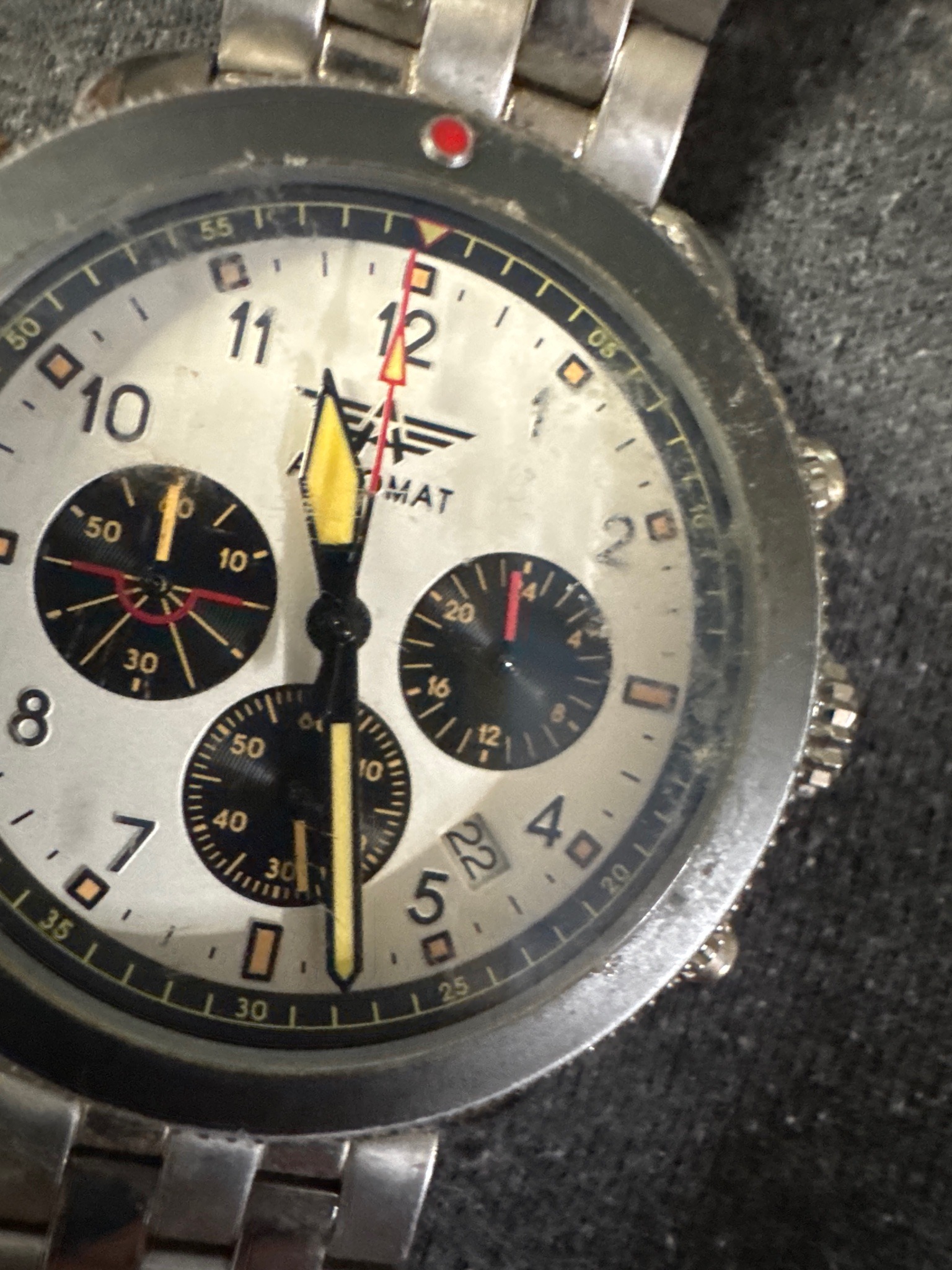 This is a vintage-style pilot's chronograph watch by the German brand Aeromatic 1912. The timepiece features a cream-colored panda-style dial with three black recessed sub-dials positioned at the 6, 9, and 12 o'clock marks, likely driven by a Seagull TY2903 or similar mechanical movement. The watch features bold yellow sword hands for house and minutes, a red-tipped sweep second hand, and a date window angled between 4 and 5 o'clock. The stainless steel case is fitted with a matching multi-link 'engineer style' bracelet. The rotating bezel is finished in a gunmetal or brushed steel tone with a distinctive red luminous pip at the zero marker. Condition-wise, the watch shows significant signs of wear and age; the crystal surface exhibits numerous scratches and scuffs, and there is visible dust or debris under the crystal on the dial surface near the center. The case and bracelet show heavy oxidation, grime, and micro-scratches consistent with long-term use without regular cleaning. The lume on the hands and markers appears aged to a yellowish patina. Despite the surface wear, the construction indicates a robust, mid-range quality enthusiast watch inspired by mid-20th-century military aviation instruments.