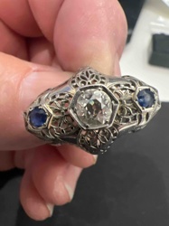 Antique 18K White Gold Round Cut Diamond and Sapphire Ring
