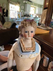 Porcelain or Bisque Doll with Flower Headdress and Pearl Necklace