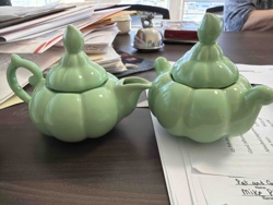 Pair of Vintage Celadon Green Pumpkin-Shaped Teapots