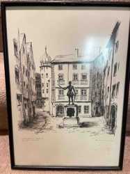 Framed Pen and Ink Illustration of Lindau Market Square with Bismarck Statue