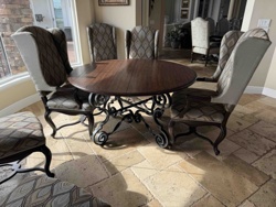 Round Wood Pedestal Dining Table with Wrought Iron Scroll Base and Upholstered Wingback Dining Chairs