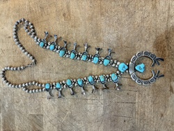 Antique Navajo Turquoise and Sterling Silver Squash Blossom Necklace