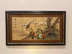 Framed Hand-Painted and Embroidered Silk Panel with Birds and Peonies