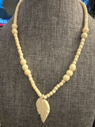 Vintage Chinese Carved Bovine Bone Beaded Necklace with Leaf Pendant