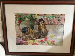 Framed Watercolor Painting of Work Boots and Autumn Leaves