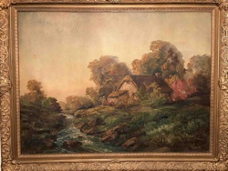 Oil on Canvas English Landscape Painting of a Cottage and Stream
