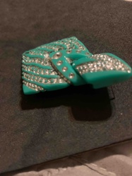Vintage Turquoise Bakelite or Plastic Costume Jewelry Brooch with Rhinestone Accents