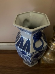 Hexagonal Blue and White Porcelain Ring-Handled Vase