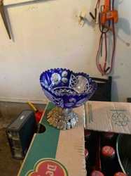 Bohemian Cobalt Blue Cut-to-Clear Crystal Compote with Ornate Metal Base