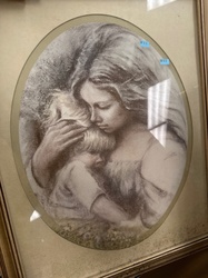 Framed Mother and Child Charcoal or Sanguine Crayon Lithograph