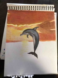 Colored Pencil Drawing of a Jumping Dolphin at Sunset