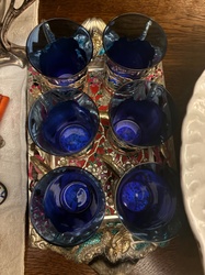 Vintage Cobalt Blue Glass Tea Service with Enamel and Gilded Metal Filigree Tray