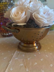 Vintage Miniature Copper Colander with Silk Rose Arrangement