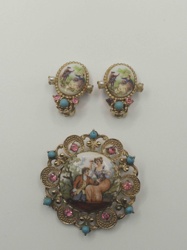 Vintage Coro Fragonard Limoges-Style Brooch and Earrings Parure Set