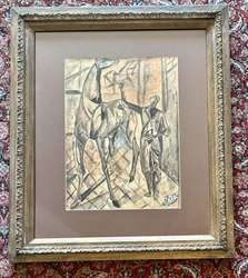 Signed Cubist Style Mixed Media Drawing of a Horse and Figure