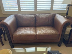 Traditional Leather Rolled-Arm Loveseat with Exposed Wood Frame