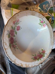 A small, round ceramic bowl featuring a floral design on the interior, with colors in pastel shades. The bowl has a smooth finish and a classic round shape, typical of vintage kitchenware.