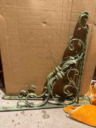 A vintage wall-mounted decorative shelf featuring ornate wrought iron scrollwork and three tiers for displaying items. The piece has a gold or brass finish, giving it an elegant appearance suitable for traditional or eclectic decor.