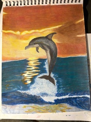 Colored Pencil Drawing of a Jumping Dolphin at Sunset