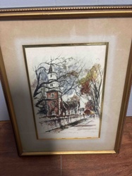 Framed Watercolor and Ink Sketch of a Church