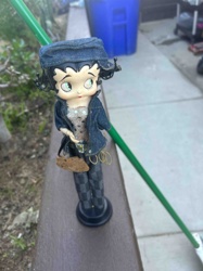 A tan plastic female fashion doll with black hair, light blue eyes, and red lips. The doll is unclothed and appears to be a generic type, possibly made in China. It shows signs of wear and tear, including some marks on the body.