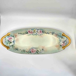 Hand-Painted Rose Motif Porcelain Celery Dish with Gilt Handles