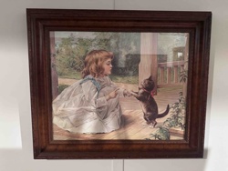 Framed Victorian Lithographic Print: Girl and Cat