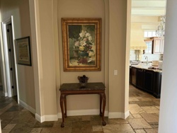Framed Floral Still Life Oil Painting and Marble-Top Cabriole Leg Console Table