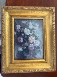 Framed Still Life Painting/Print with Flowers, Silver Urn, Box, and Bird
