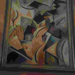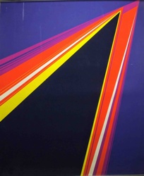 An abstract painting featuring geometric shapes and vibrant colors, including circles, squares, and lines. It exhibits an exploration of space and form, typical of modern abstract art.