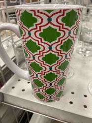 Tall Latte Mug with Green and Red Quatrefoil Geometric Pattern