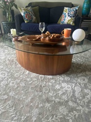 Mid-Century Modern Style Oval Glass Coffee Table with Teak Cylinder Base