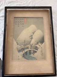 Japanese Ukiyo-e Woodblock Print: Winter Landscape with Bridge