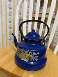 Vintage Cobalt Blue Enamel Tea Kettle with Peacock Decal