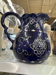 Cobalt Blue Glazed Ceramic Pitcher with Raised Relief Patterns